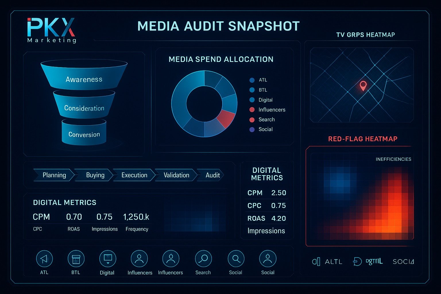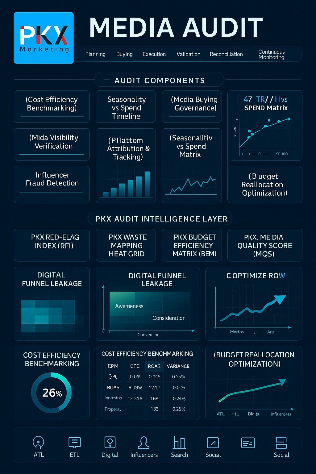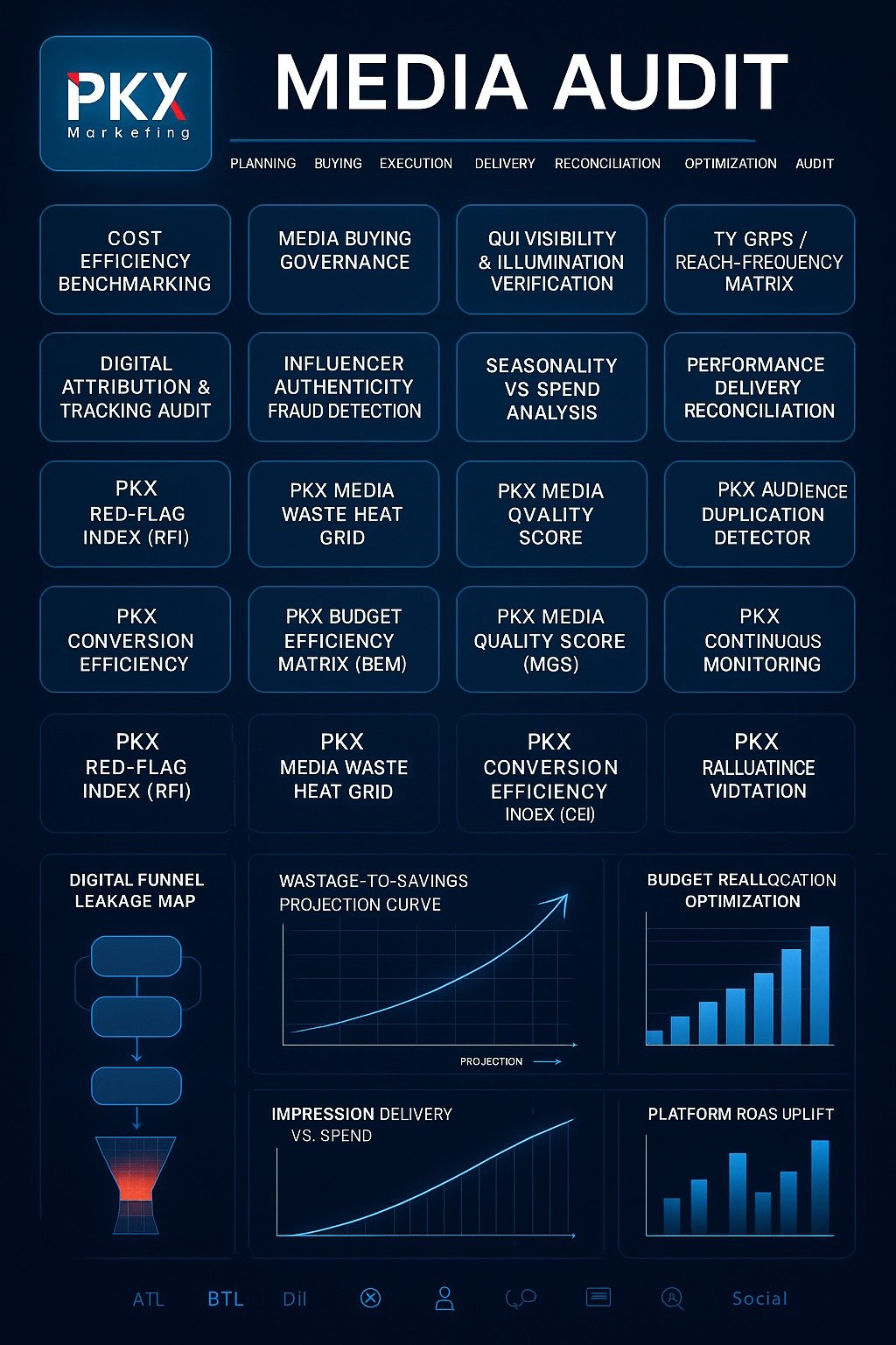 A Media Audit is a comprehensive forensic examination of all your marketing, ATL, BTL, and digital media investments. It is conducted by an independent third-party (PKX Marketing) to evaluate: